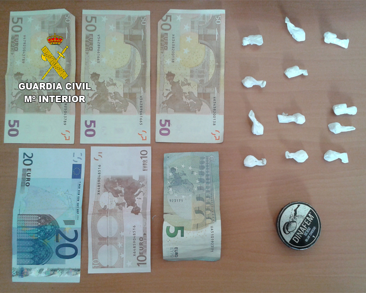 Tras la identificación y el registro superficial de los ocupantes así como el control del vehículo, les intervinieron al acompañante siete papelinas de cocaína que ocultaba entre su ropa, así como 185 euros en billetes de diverso valor, procediéndose a la detención del mismo por un delito de tráfico de drogas.