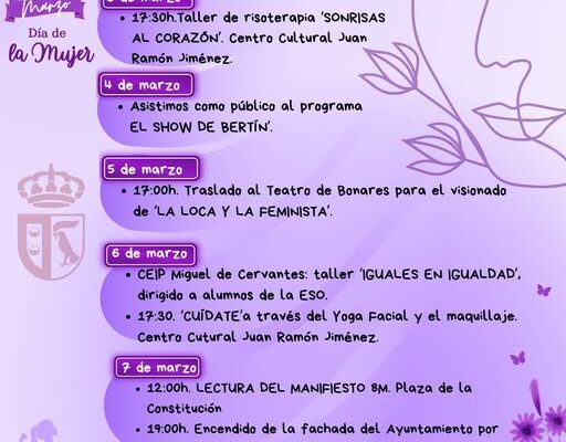 Los talleres tendrán lugar desde el lunes 3 hasta el 8 de marzo, día en el que se les dará un reconocimiento a dos mujeres del municipio lucenero.